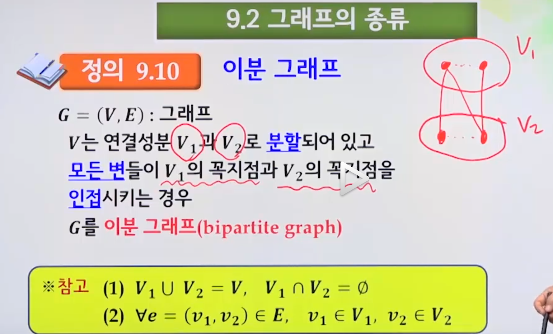 임의의 V1에서 한 꼭지점과 V2에서 한꼭지점을 선택했을때 edge가 존재해야함