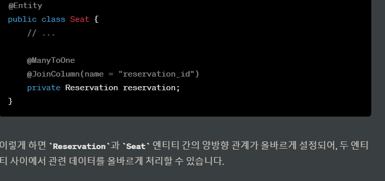 Seat 엔티티에 @ManyToOne 어노테이션과 해당 JoinColumn을 정의하지 않으면, Seat 엔티티는 Reservation 엔티티와의 관계에 대한 정보를 갖지 못하게 됩니다. 이 경우, 관계 설정이 올바르게 수행되지 않아 예기치 않은 동작이나 에러가 발생할 수 있습니다.