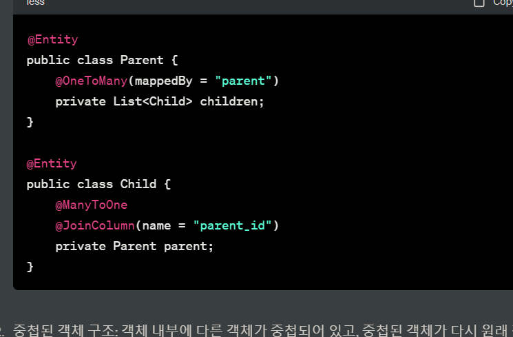 양방향 연관 관계: 두 엔티티 간에 양방향 연관 관계가 있는 경우, 두 엔티티가 서로를 참조하게 되어 순환 참조 문제가 발생할 수 있습니다. 예를 들어, 부모 엔티티가 자식 엔티티를 가지고 있고, 자식 엔티티가 부모 엔티티를 참조하는 경우입니다.