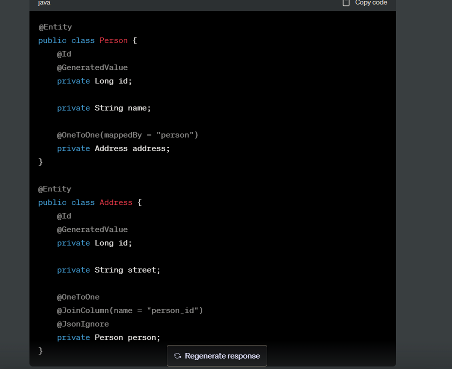 예를 들어, Person과 Address 엔티티가 양방향 @OneToOne 관계를 갖고 있다고 가정하겠습니다.