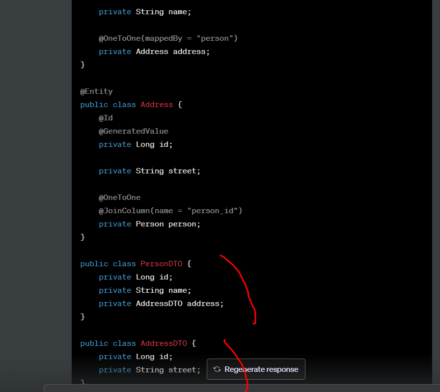 DTO를 사용하여 엔티티를 JSON으로 변환하고, 순환 참조가 발생하지 않도록 엔티티 간 관계를 정의할 수 있습니다. 예를 들어, 아래는 양방향 @OneToOne 관계를 가진 Person과 Address 엔티티와 이에 대응하는 DTO 클래스입니다.