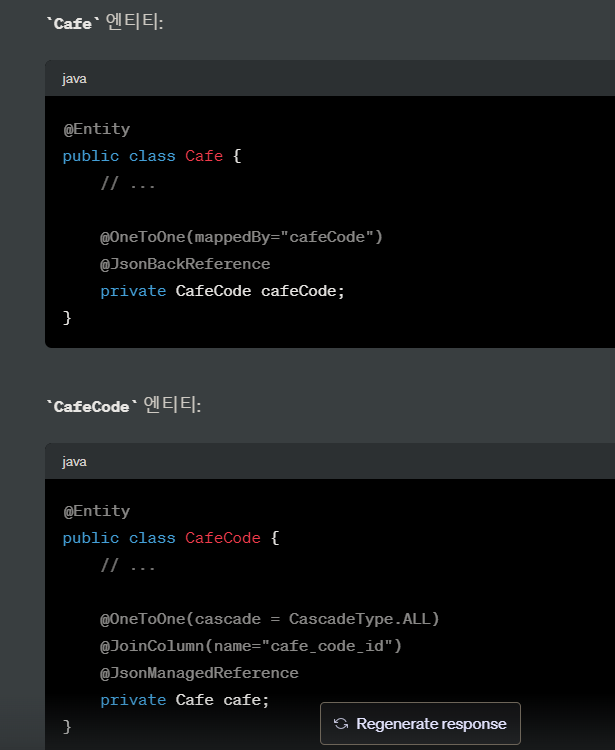 CafeCode 엔티티와 Cafe 엔티티 사이에 양방향 @OneToOne 관계가 설정되어 있습니다. 이렇게 양방향 관계를 설정할 때, JSON 직렬화 과정에서 순환 참조 문제가 발생할 수 있습니다. 이 문제는 한 엔티티에서 다른 엔티티를 참조하고, 다시 다른 엔티티에서 원래 엔티티를 참조할 때 발생합니다.