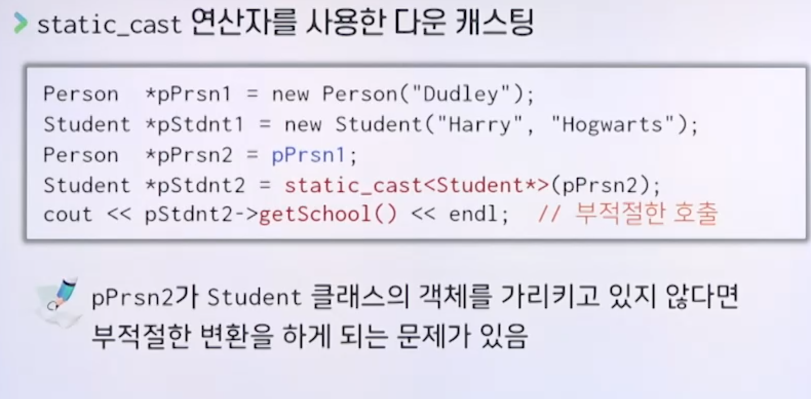 - 이 변환은 컴파일 시점에 타입 검사 없이 허용되지만, 런타임에 pPrsn2가 실제로 Student 객체가 아니라면, **정의되지 않은 동작(Undefined Behavior)**이 발생합니다.