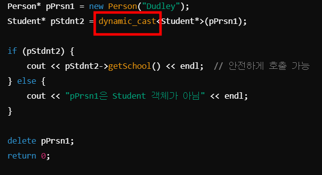 - dynamic_cast는 RTTI(런타임 타입 정보)를 사용하여, 실제로 pPrsn1이 Student 객체를 가리키는지 확인합니다.