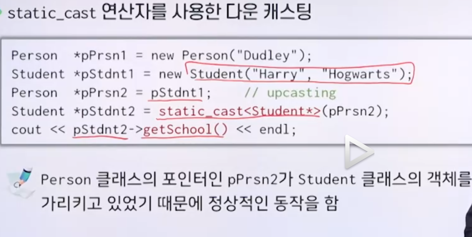 - static_cast<Student*>를 사용하여 pPrsn2를 Student*로 변환.