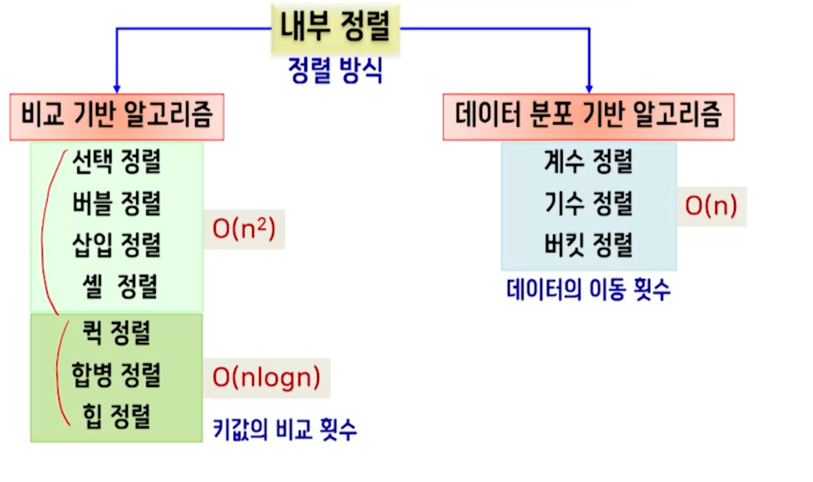 내부정렬: 전체 데이터를 주기억장치에 저장한 후 정렬을 수행하는방식외부정렬 : 모든데이터를 주기억장치에 저장할수 없는경우 보조기억장치에 저장해두고 그중 일부 데이터만을 반복적으로 주기억장치로 옮겨와서 정렬을 수행하는 방식 선택정렬: 입력 배열에서 가장 작은 값부터 순서대로 선택해서 나열하는 방식배열에서 정렬되지않은부분에서 가장 작은값을 찾아서 정렬되지않은부분의 맨앞과 교체하는방식 버블정렬 : 모든 인접한 두 데이터를 차례대로 비교해서 왼쪽데이터가 더큰 경우에는 오른쪽 데이터와 자리를 바꾸는 과정을 반복해서 정렬을 수행하는 방식ㄴ왼쪽에서 오른쪽으로 진행되면 가장 큰값이 오른쪽끝부터 위치된다ㄴ오른쪽에서 왼쪽으로 진행하면 가장 작은값이 왼쪽끝에 위치한다. 삽입정렬 : 주어진 데이터를 하나씩 뽑..