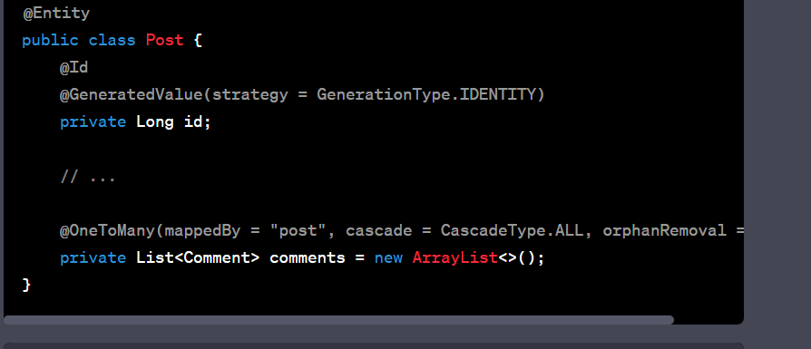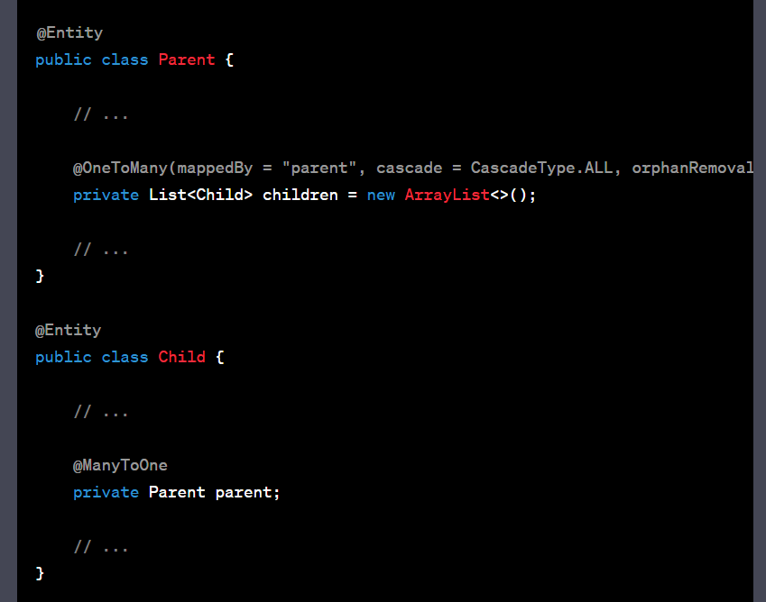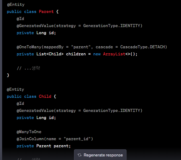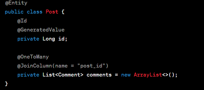 @Entity @Data @ToString(exclude = "member") @NoArgsConstructor public class OrderInfo { @Id @GeneratedValue(strategy = GenerationType.IDENTITY) private Long orderId; // 오더 아이디 (pk) @Column(length = 16, nullable = false) private String orderNo; // 주문번호 @CreationTimestamp private Date orderDate; // 주문날짜 @ManyToOne(fetch = FetchType.LAZY) @JoinColumn(name = "member_id") private Member member; // 주문..