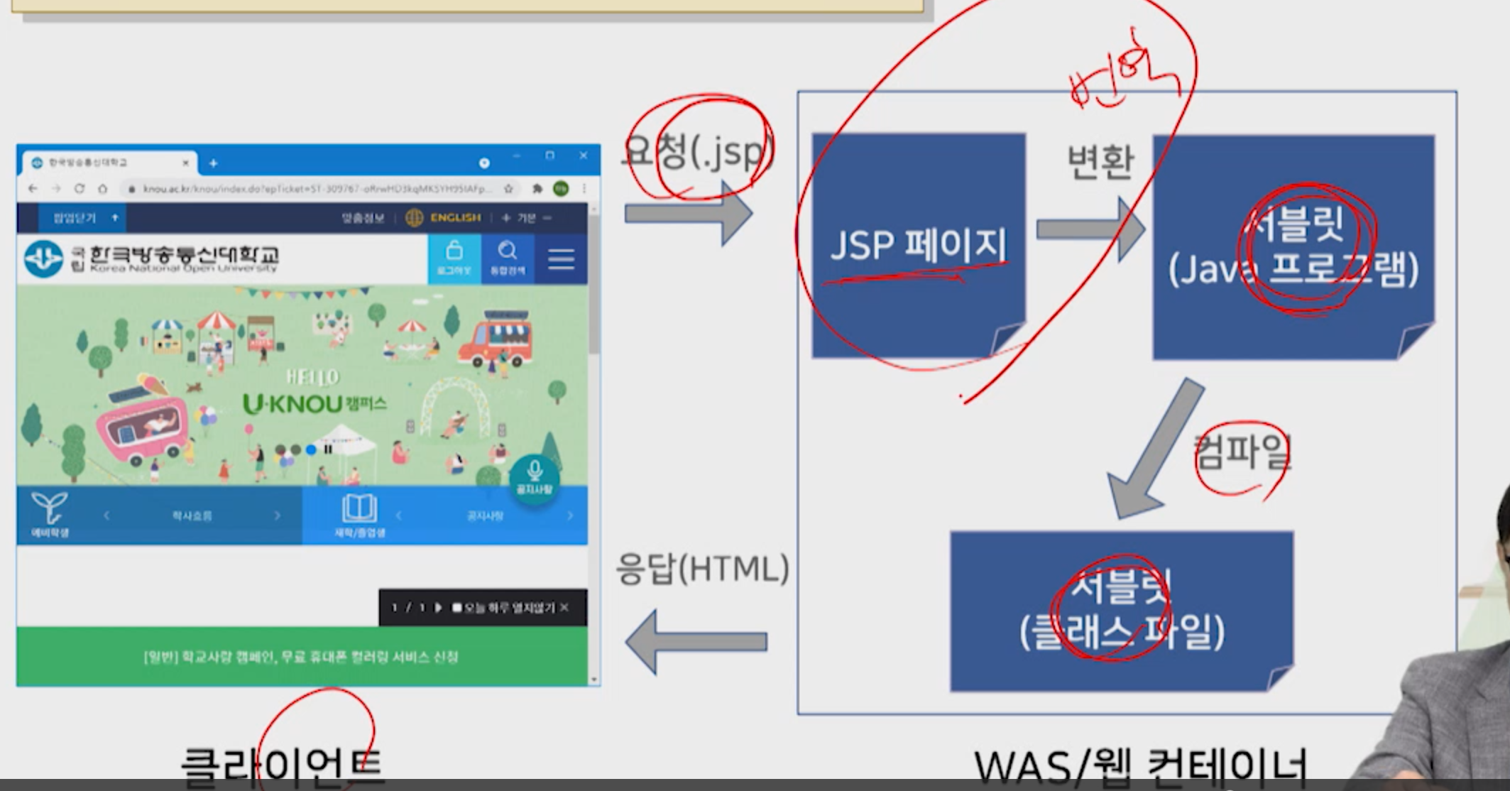 - 웹 애플리케이션 서버가 자동으로 JSP페이지를 변환하고 컴파일하여 웹서비스를 제공함