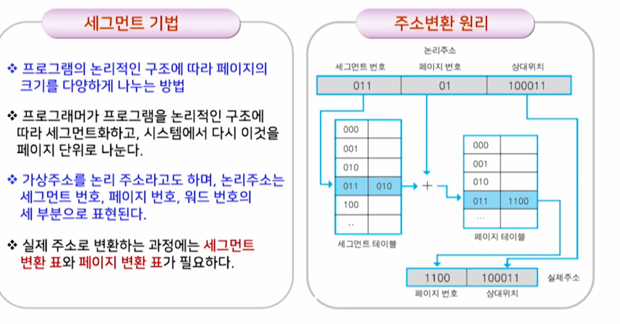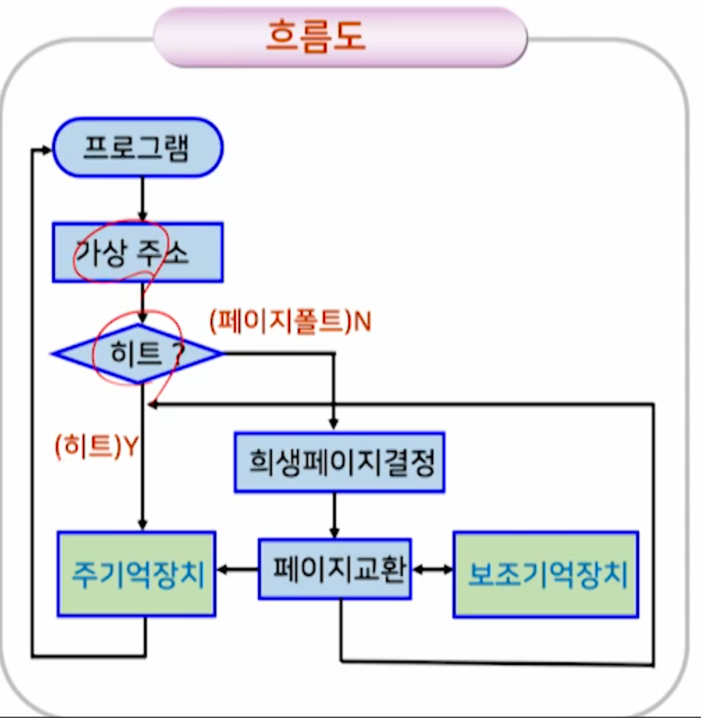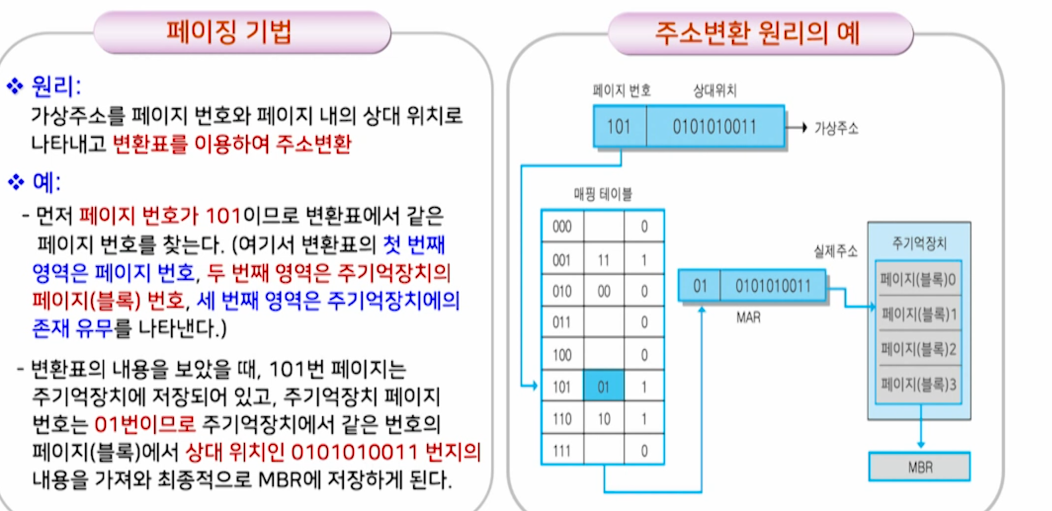 - 중앙처리장치가 가상주소로 기억장치에 접근하려면 이 가상주소가 변환표에서 물리주소로 변환되어 이 주소로 실제 주기억장치에 접근한다.