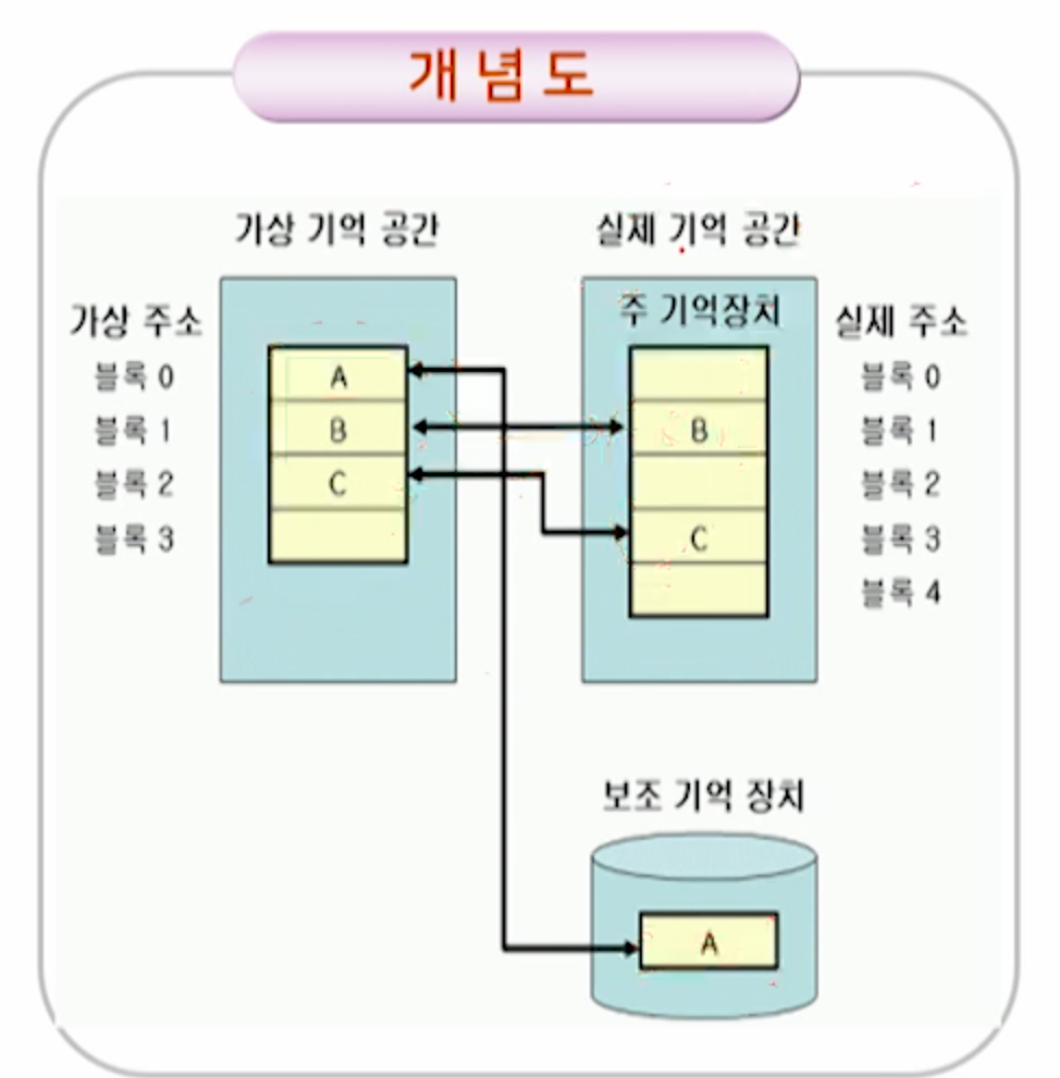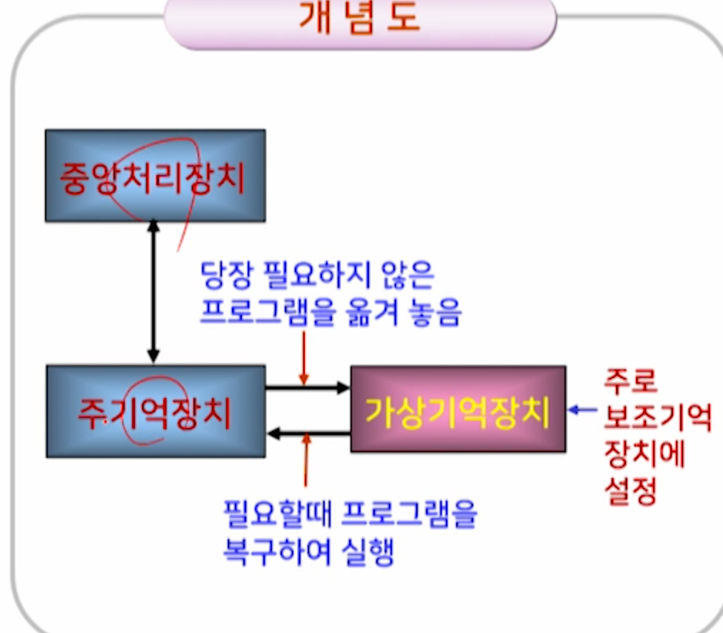 이러한 일련의 작업들은 운영체제가 담당하는것이므로 중앙처리장치의 입장에서보면 픙로그램에 필요한 모든 내용이 마치 주기억장치에 있는것처럼 사용하는 것