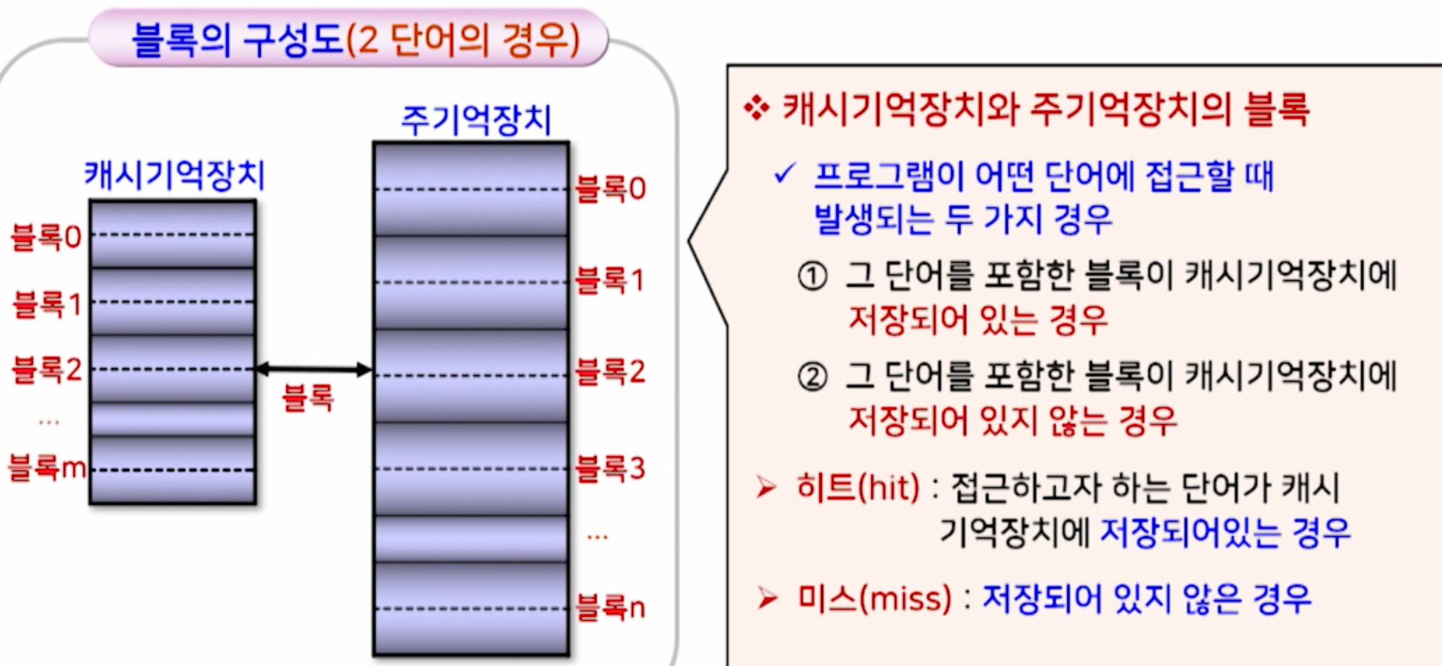 -주기억장치와 캐시기억장치는 모두 같은 수의 단어로 구성된 블록으로 나뉘어져있다.