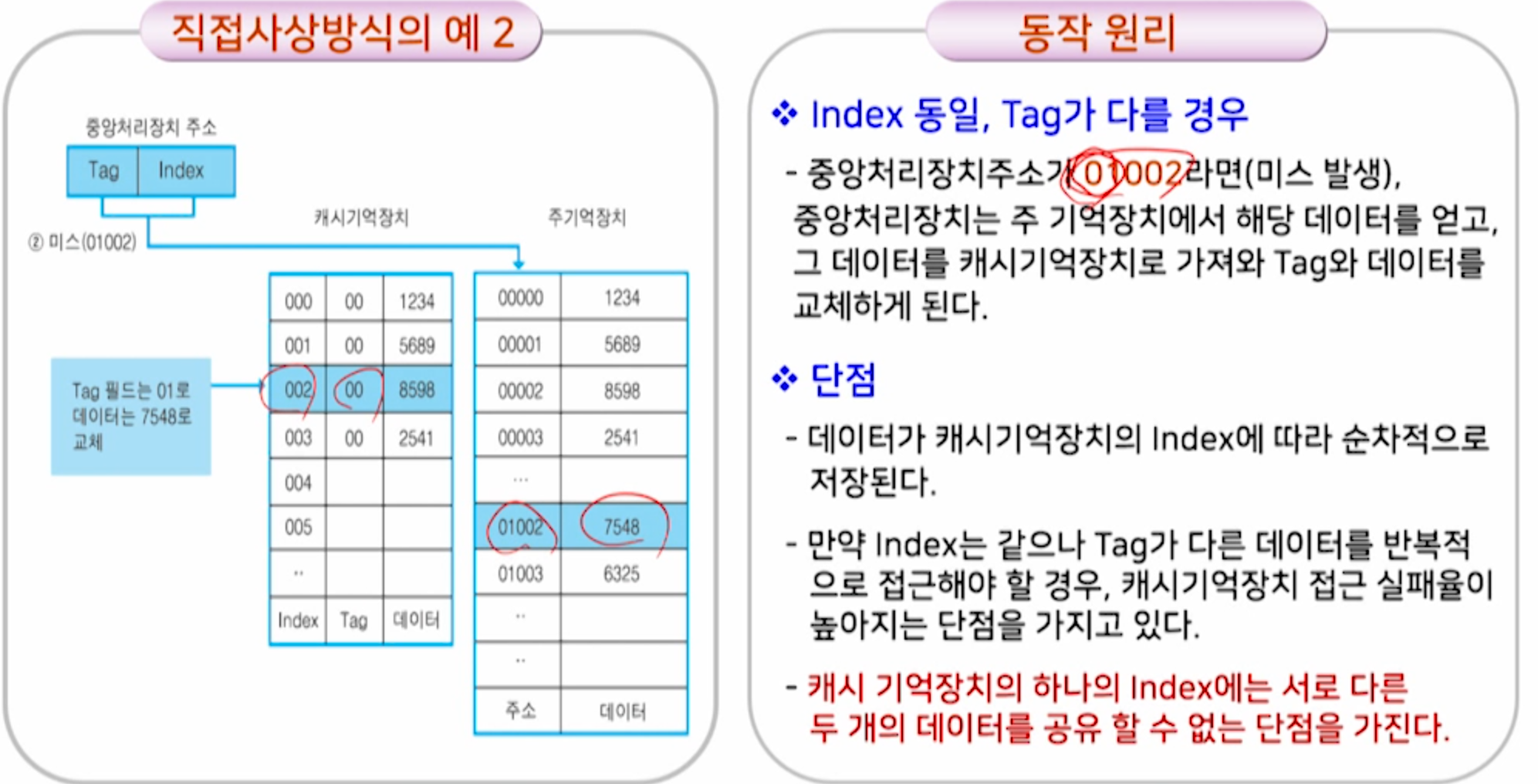 - 만약 같은 index에 데이터가 없거나 또는 index는같으나 tag가 다르면 주기억장치에서 데이터를 찾아 가져오는 방식