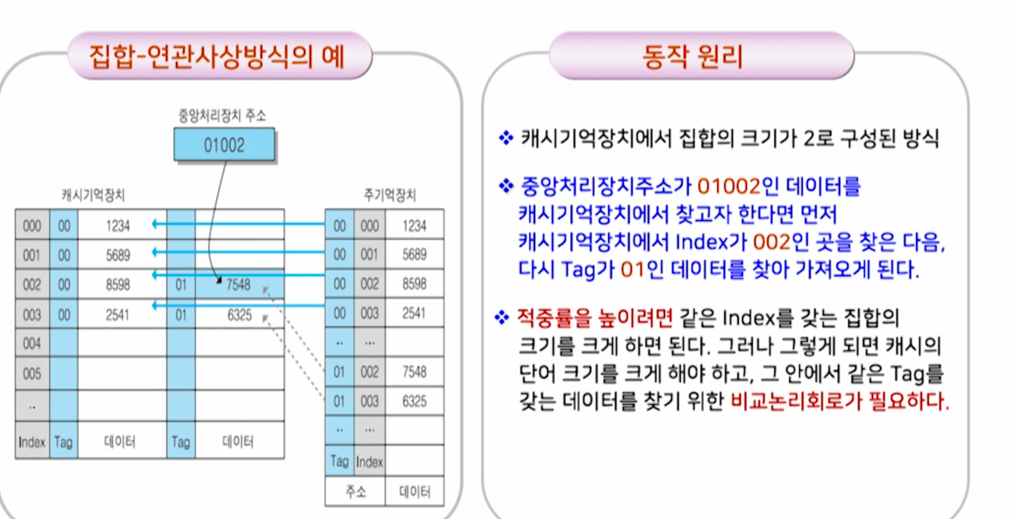 -- 캐시기억장치에서 중앙처리장치 주소의 index와 같은 index를 찾은후 그 index에 저장되어있는 서로 다른 tag를 갖는 데이터들 중에서 연관 사상방식에서와 같은 방식으로 찾고자하는 데이터의 tag와 같은 tag를 갖는 데이터를 찾아 가져온다