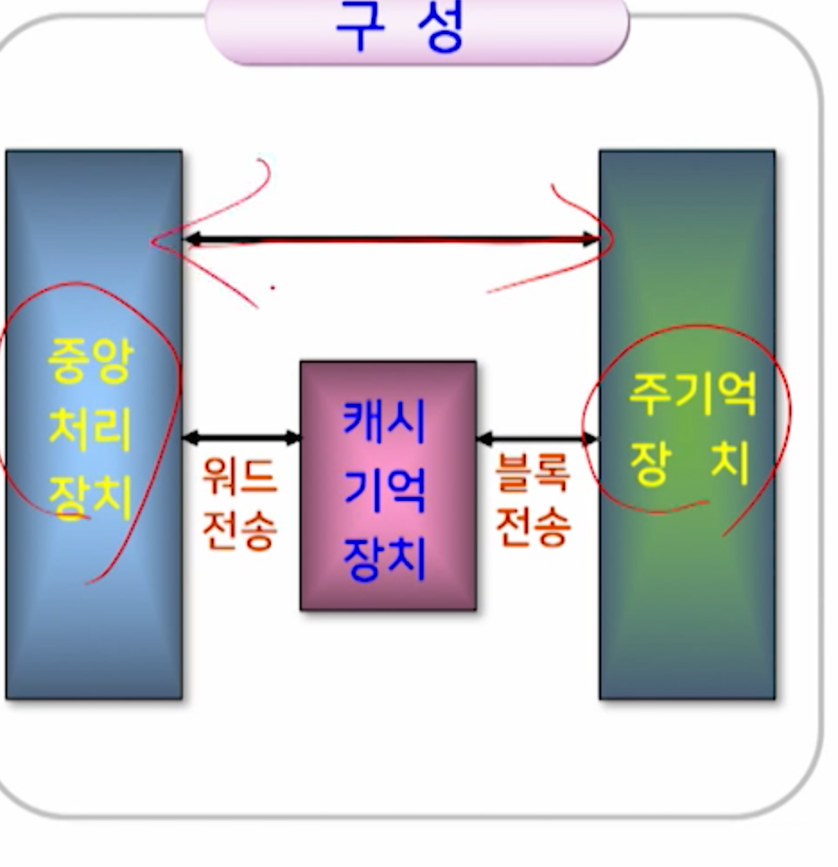 - 접근시간 - cpu와 주기억장치 사이에 데이터처리시간과 연산시간 차이가 발생. 두 장치간의 속도차이를 개선할 필요