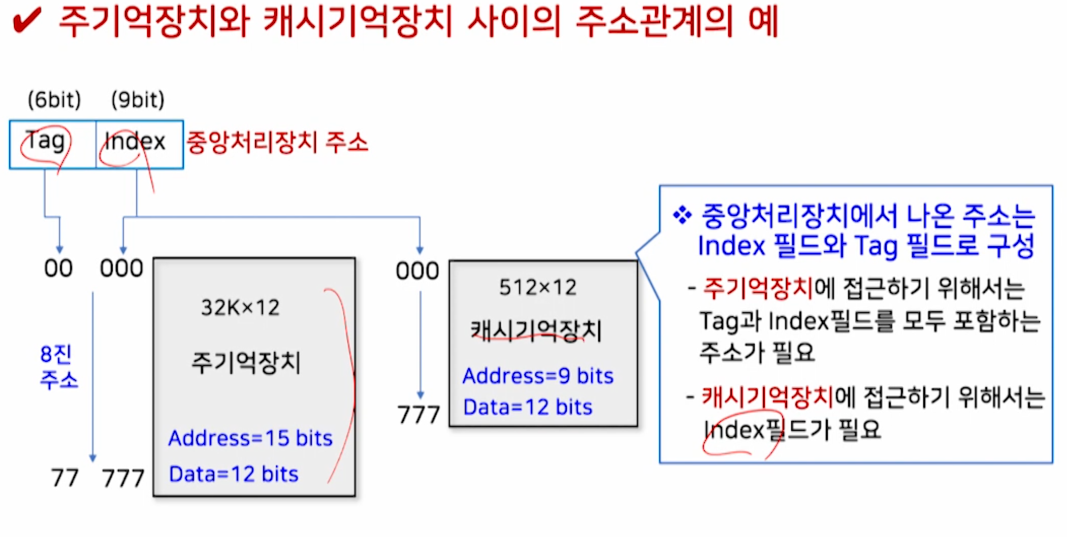 - 따라서 중앙처리장치가 주기억장치에있는 데이터를 캐시기억장치에서 접근하려면 그 데이터를 미리 캐시기억장치로 옮겨놓아야함